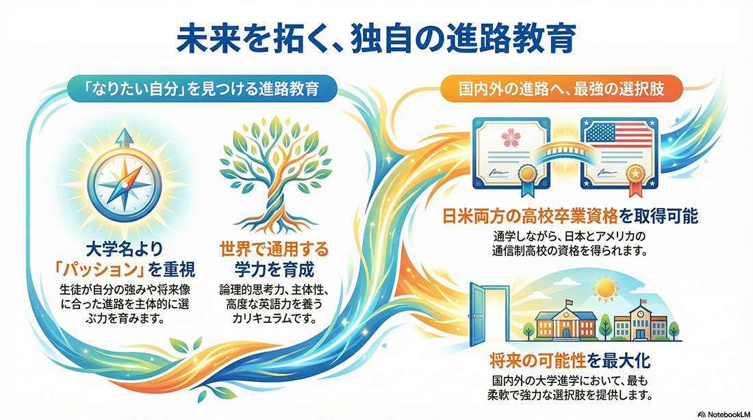 高等部では、日本の高校卒業資格と、連携するアメリカの通信制高校の卒業資格、日英両方の高校卒業資格の取得が可能です。実際にキャンパスに通いながら、双方の資格を得られるこのシステムは、生徒が将来、国内外のどのような進路を選ぶにしても、最も柔軟で強力な選択肢を提供します。