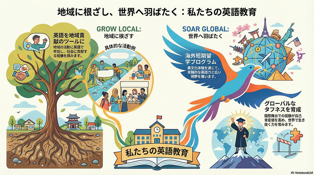 本校は、地域に根差した活動(GROW LOCAL)にも積極的に英語を活用します。例えば、地域の環境保護活動や、国際交流イベントへの参加などを通じて、英語を社会に貢献するためのツールとして使用します。学校のモットーである「GROW LOCAL, SOAR GLOBAL」(ローカルに根を張り、グローバルに羽ばたく)を体現する、ユニークな実践の場です。