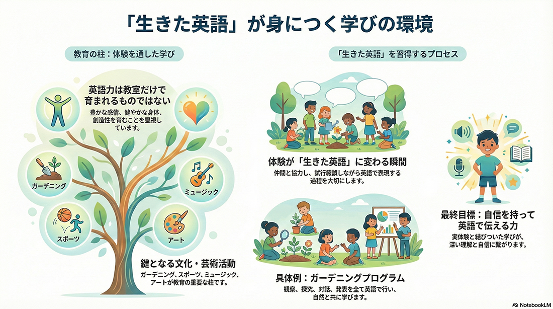 特にガーデニングプログラムでは、自然との共生を体験的に学びながら、観察・探究・対話・発表を英語で行います。